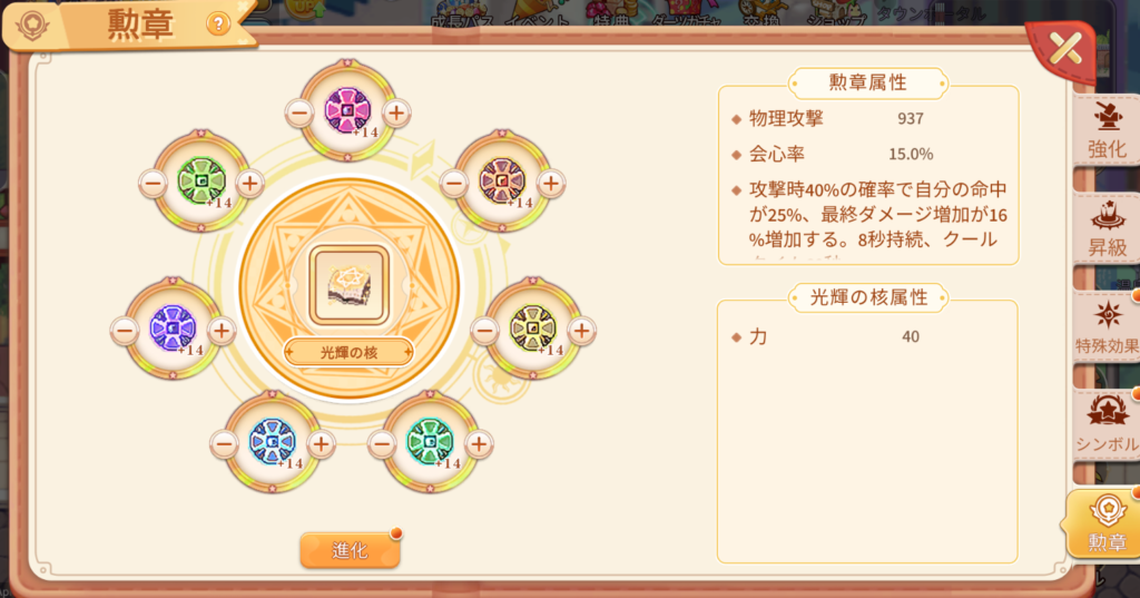 勲章を7個装着すると「光輝の核」が活性化します。